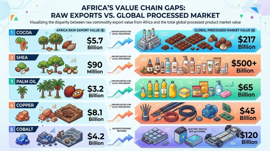 The gap between raw material exports and processed product revenues represents one of the largest missed economic opportunities on the continent.