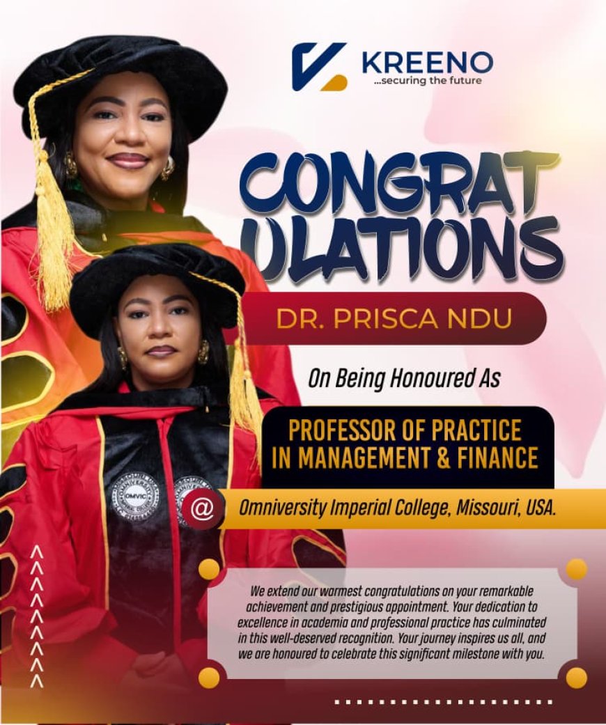 History was made as Dr. Prisca Ndu, Director of Strategic Partnerships at Kreeno Consortium, was conferred with the title of Professor of Practice in Management and Finance by The Omniversity Imperial College, Missouri, USA. The honor recognizes her exceptional leadership, academic excellence, and industry impact in advancing finance, corporate strategy, and sustainable business growth across Africa.
