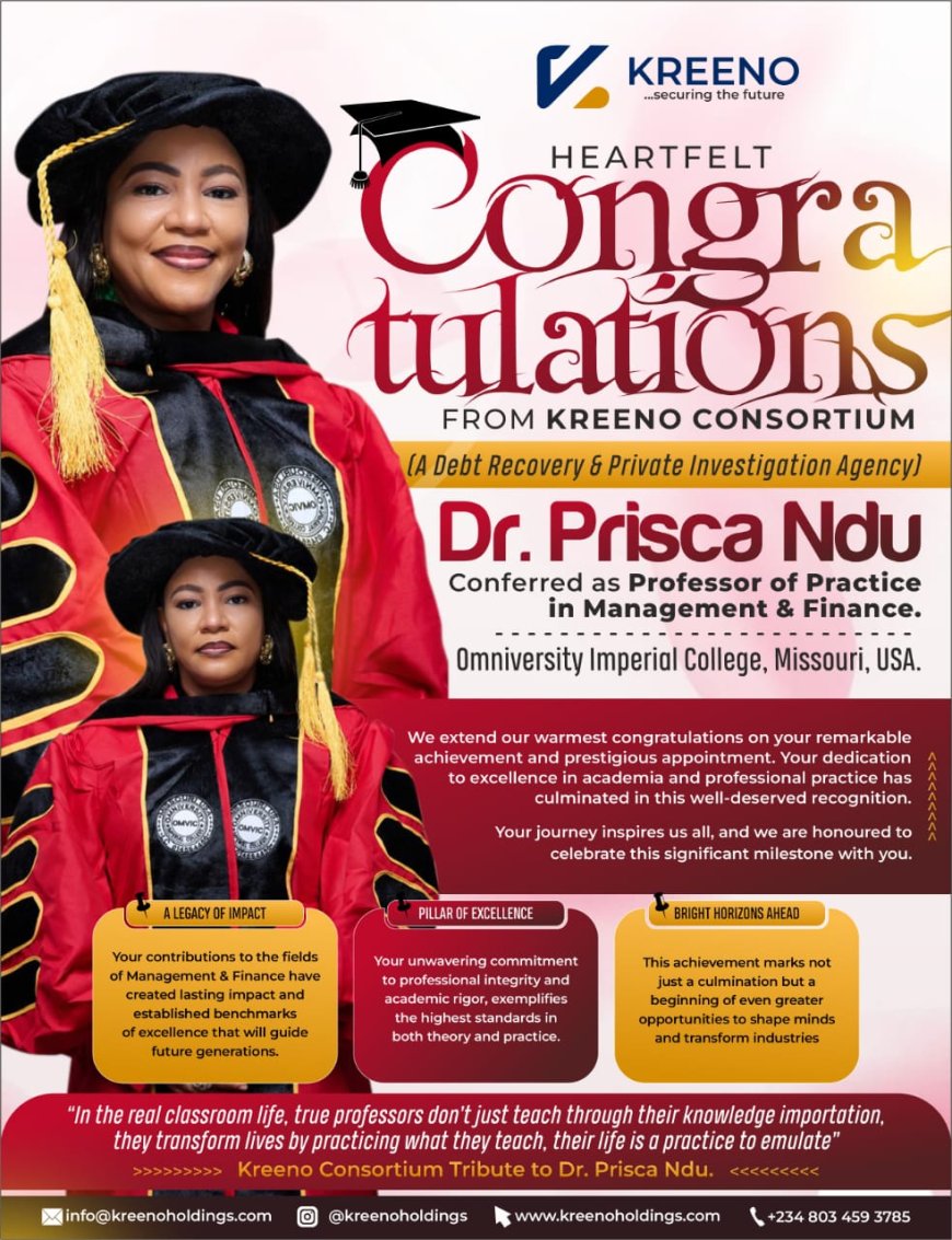 Dr. Ojeagbase reaffirmed that KREENO Consortium, through its integrated operations in debt recovery, corporate governance, and investigative intelligence, is strategically positioned to support Nigeria’s transition toward financial discipline, business integrity, and sustainable economic transformation.