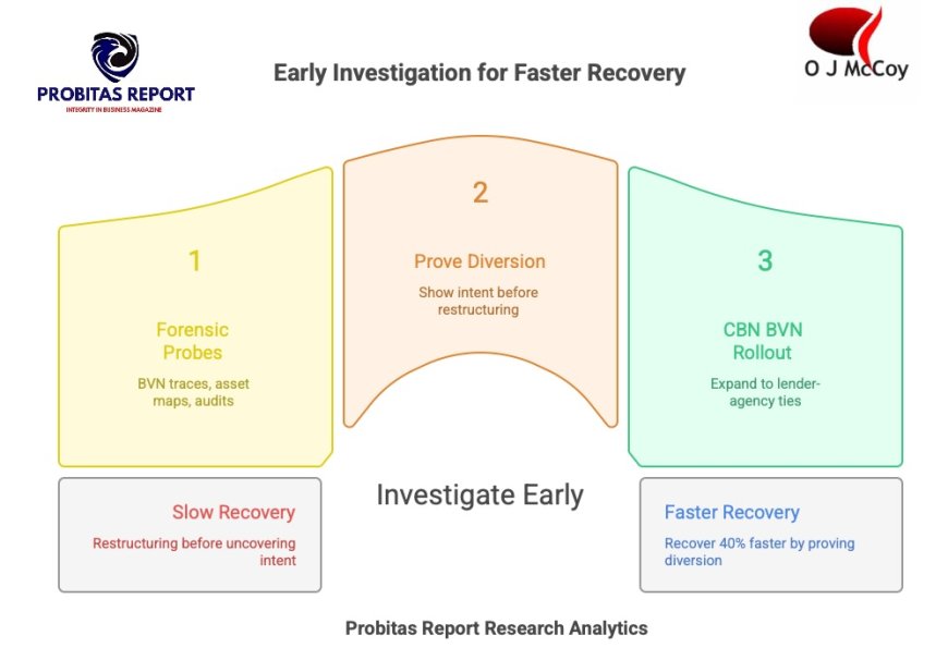 Flip the script: investigate early. Forensic probes - BVN traces, asset maps, cash flow audits to uncover intent before restructuring. KREENO-style agencies recover 40% faster by proving diversion. CBN's BVN rollout cut evasion; expand to mandatory lender-agency ties.