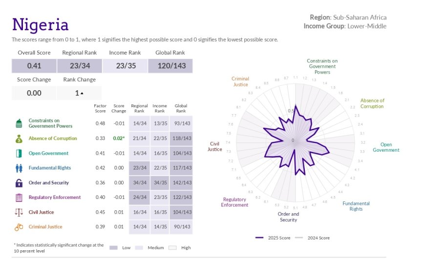 In 2025, Nigeria ranked 120th of 143 countries in the World Justice Project's rule of law index. Nigeria rated much lower than most all of its peers regarding access to civil justice and regulation.